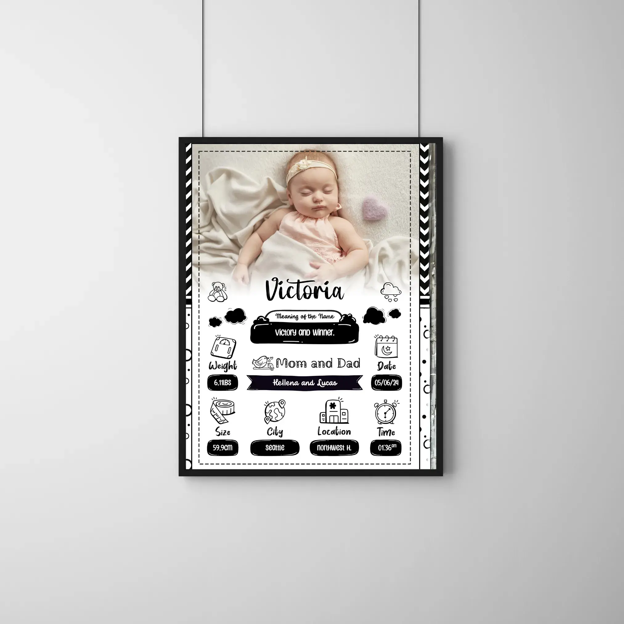 This frame is designed for those who believe that simplicity is the ultimate sophistication. With personalized details like âVictoria,â birth stats, and a clean structured layout, it becomes a refined memory piece.