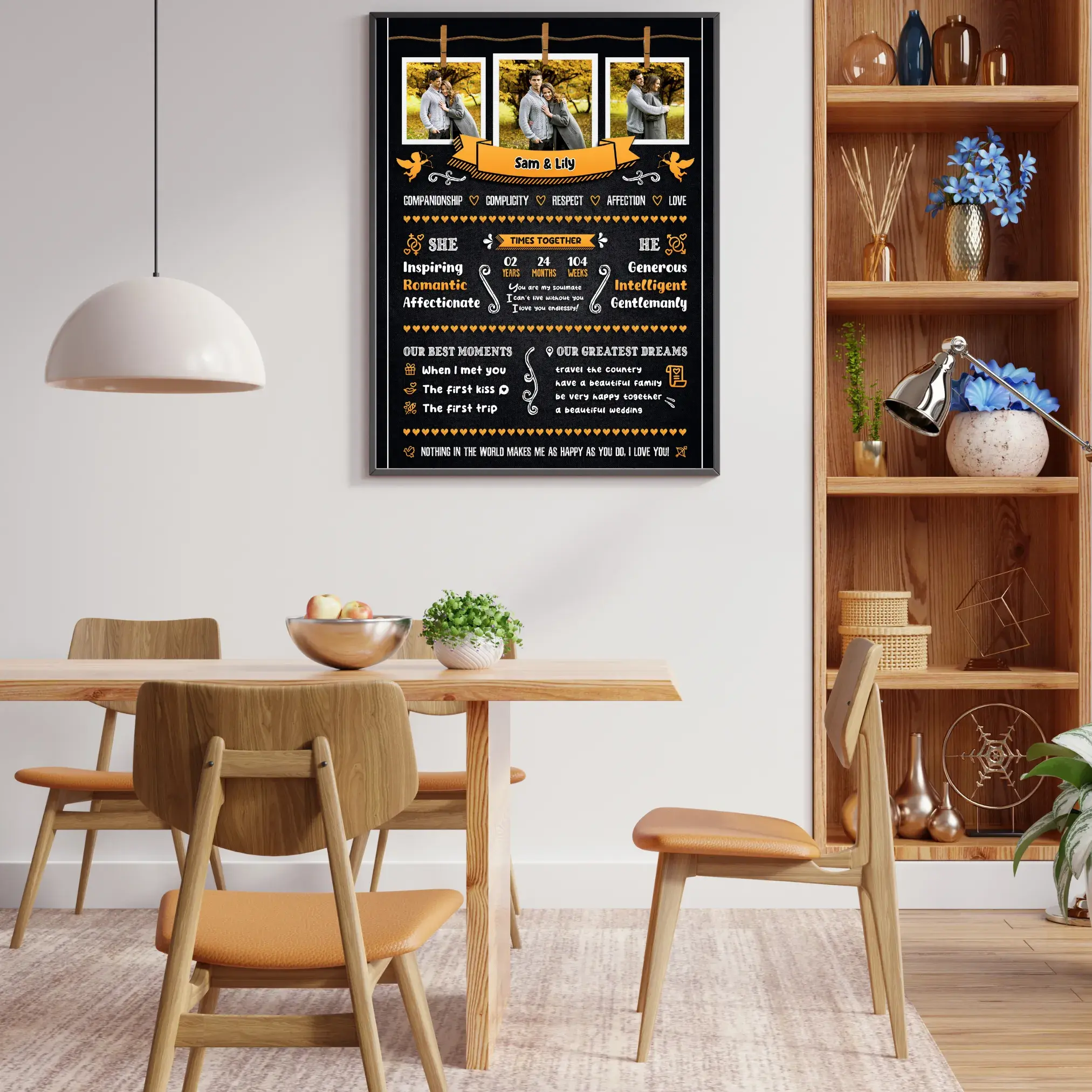 At the top, your favorite couple photos are displayed in a hanging collage style, while the rest of the frame highlights your relationship details — from the time you’ve spent together to your best moments and future dreams.